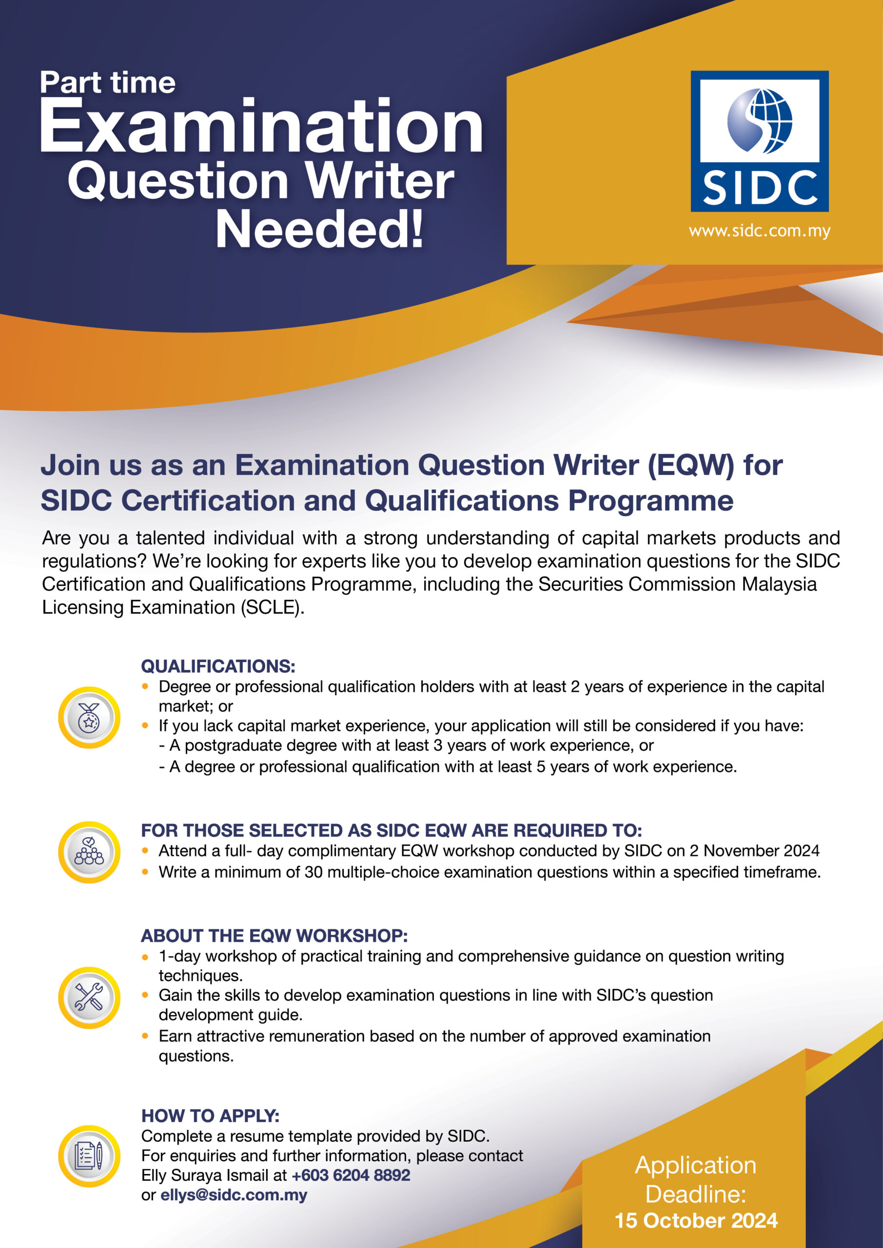 Are you a talented individual with a strong understanding of capital markets products and regulations? We’re looking for experts like you to develop examination questions for the following SIDC Certification and Qualifications Programme, including: